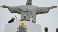 1. Cristo! De que outro lugar, no Brasil e fora dele, fazer ecoar este nome – o único que nos pode salvar (cf. At 4,12) – e que tem um particular direito de cidadania na história do homem e da Humanidade (“Redemptor Hominis”, n. 10) melhor do que do alto deste imenso penhasco feito altar, entre maravilhas naturais, criadas por Ele, o Verbo de Deus (cf. Jo 1,3), bem no coração do Rio de Janeiro. Aqui a estátua que, há precisamente 50 anos, todo um povo quis erguer no cimo do pedestal natural se fez a um tempo símbolo, apelo e convite.