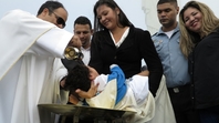 A mãe do pequeno Yudi, de 1 ano, a dona de casa Flavia da Silva Nunes, de 33 anos, estava emocionada com a oportunidade de batizar o filho no Santuário Cristo Redentor: